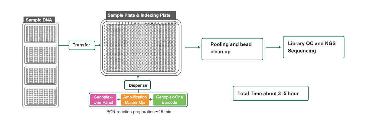 Following a one-step PCR amplification (~2.5 hours) and a quick pooling/purification step (~1 hour), this process allows for the genotyping of