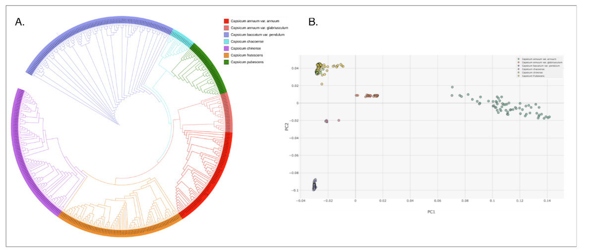 Using the retrieved 45K SNPs, phylogenetic trees and principal component analysis (PCA) are generated to evaluate the panel’s effectiveness in capturing genetic relationships and evolutionary patterns within the Capsicum lineage.