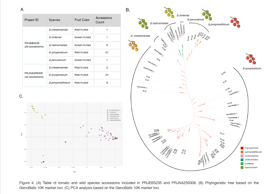 Using the retrieved 10K SNPs, a phylogenetic tree and principal component analysis (PCA) are generated to assess the panel’s ability to recover known evolutionary relationships within the tomato lineage.